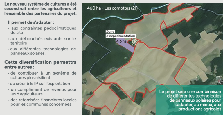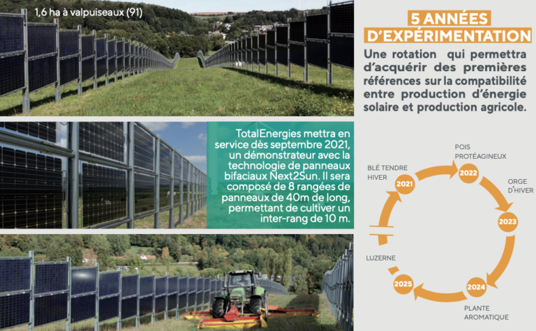 Ce projet agrivoltaïque illustre l’implication de TotalEnergies dans ce domaine. Il a été initié par un collectif de 6 agriculteurs dont le but était d’augmenter la rentabilité de certaines de leurs parcelles à faible rendement (rotation colza/blé/orge) situées sur des plateaux superficiels à faible réserve utile.