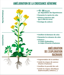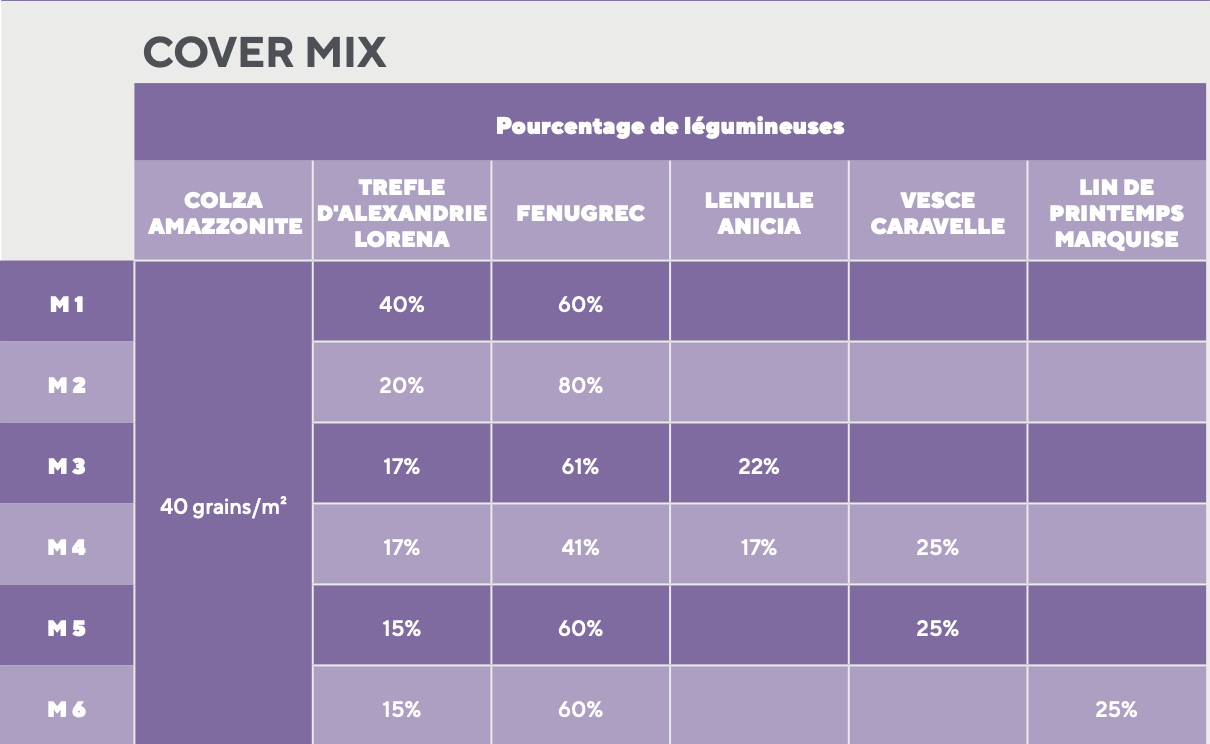 CoverMix est un mélange innovant basé sur l’association de semences de colza avec plusieurs espèces de légumineuses. Outre l’intérêt de répondre à un nouveau système d’agriculture, ce mélange apporte une solution à la culture du colza fortement impacté par des insectes automnales. Restructuration du sol, meilleure capacité d’assimilation, augmentation de la dynamique de croissance du colza à l’automne, perturbation visuel et olfactive des insectes sont autant de points positifs qui sécurisent la culture du colza et son avenir.