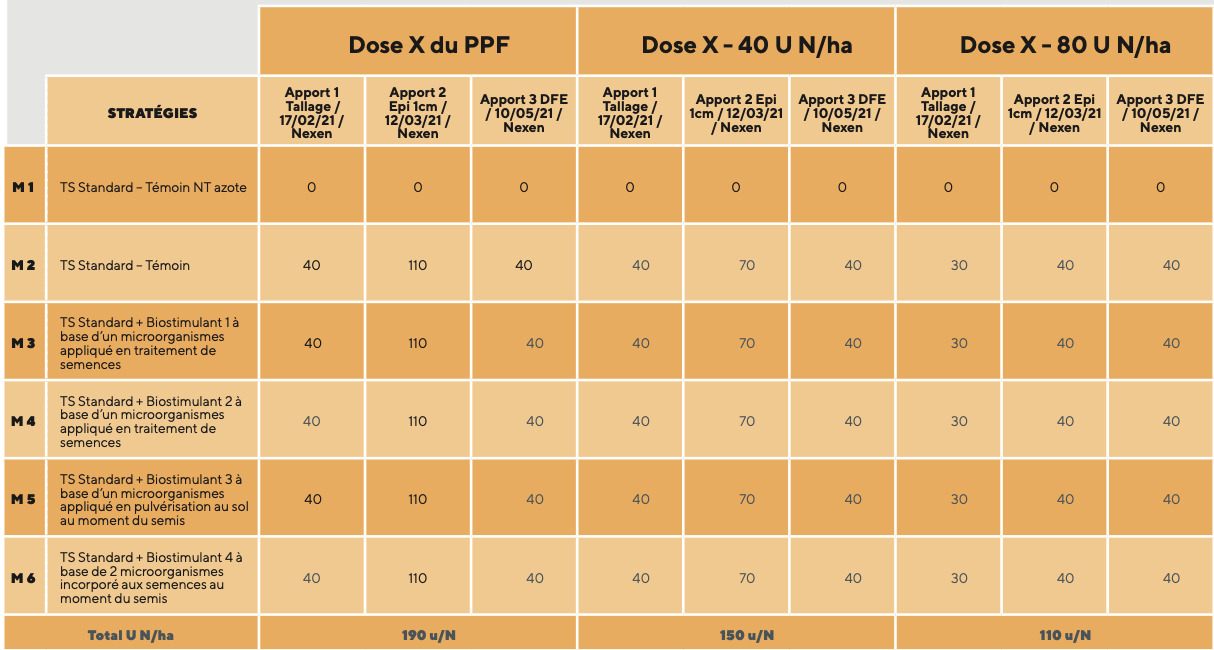 - Evaluer leur efficacité sur le rendement en apportant différents niveaux d’apports azotés (X = Apport Agriculteur, X -80 = Apport agriculteur – 80 unités, X -40 = Apport agriculteur – 40 unités